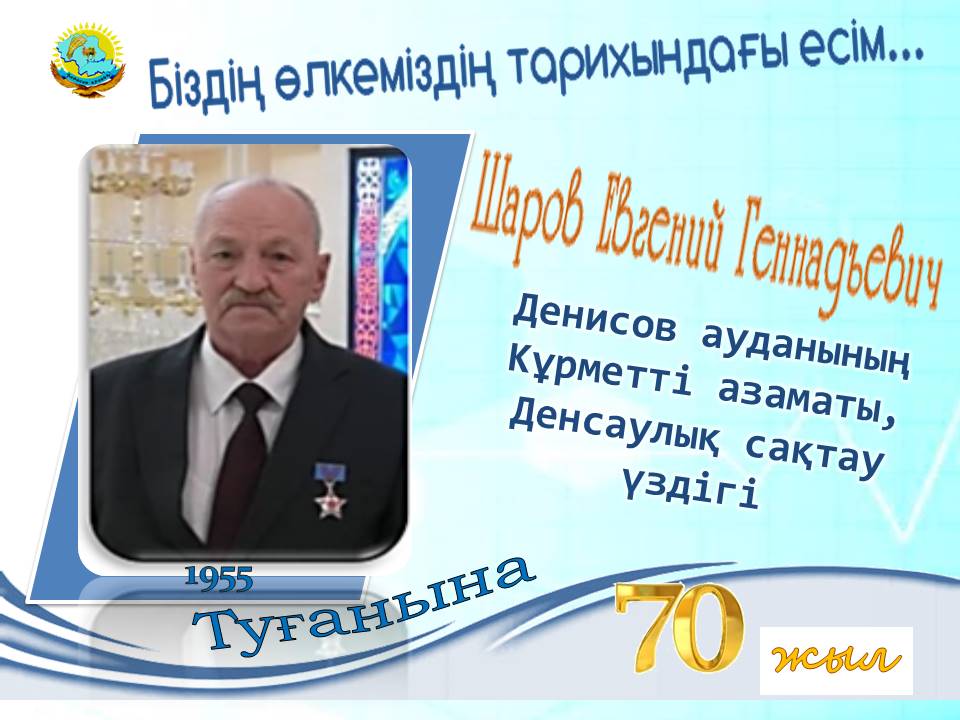 Денисов тарихи-өлкетану музейі "Біздің өлкеміздің тарихындағы есімдері" атты ақпараттық постерлерды жариялауды жалғастырады. Кезекті постер Денисов ауданының Құрметті азаматы Шаров Евгений Геннадьевичтің (1955) туғанына 70 жыл толуына арналған.