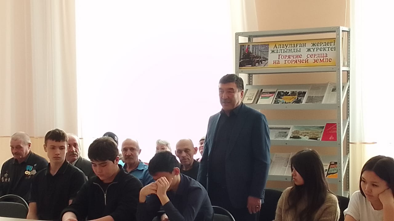 Қонақтар өлкетану музейіне келіп, «Ауғанстан. 1979–1989» көрмесінде ұсынылған фотоқұжаттық материалмен танысты. Содан кейін аудандық кітапхананың оқу залында мәдениет Үйі мен кітапхана қызметкерлері ұйымдастырған дөңгелек үстел отырысы өтті. Кешіміздің кейіпкерлерін аудан әкімінің орынбасары Е. Н. Подело жылы қарсы алды, аудандық мәдениет Үйінің солистерінің орындауында әндер шырқалды, ауған жауынгерлерінің жұбайлары мен жесірлеріне гүл шоқтары табысталды. Біз Ауғанстан туралы деректі фильмнің үзінділерін, Денисов ауданының интернационалист-жауынгерлері туралы презентацияларды бірге көрдік, бір минут үнсіздікпен кеткендерді еске алдық. Ауған соғысының ардагері Х.А. Шаймарданов пен интернационалист жауынгердің жесірі Г.Т. Қадамбаева жас ұрпаққа жылы лебіздерін білдіріп, қолдау көрсетті. Іс-шара дастархан басында шай ішумен аяқталды.